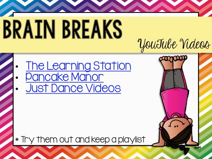 You can find brain break videos on YouTube. I strongly suggest that you WATCH them before playing them in your classroom. You never know what you can find on the internet, so make sure you view each video before using it with your class.