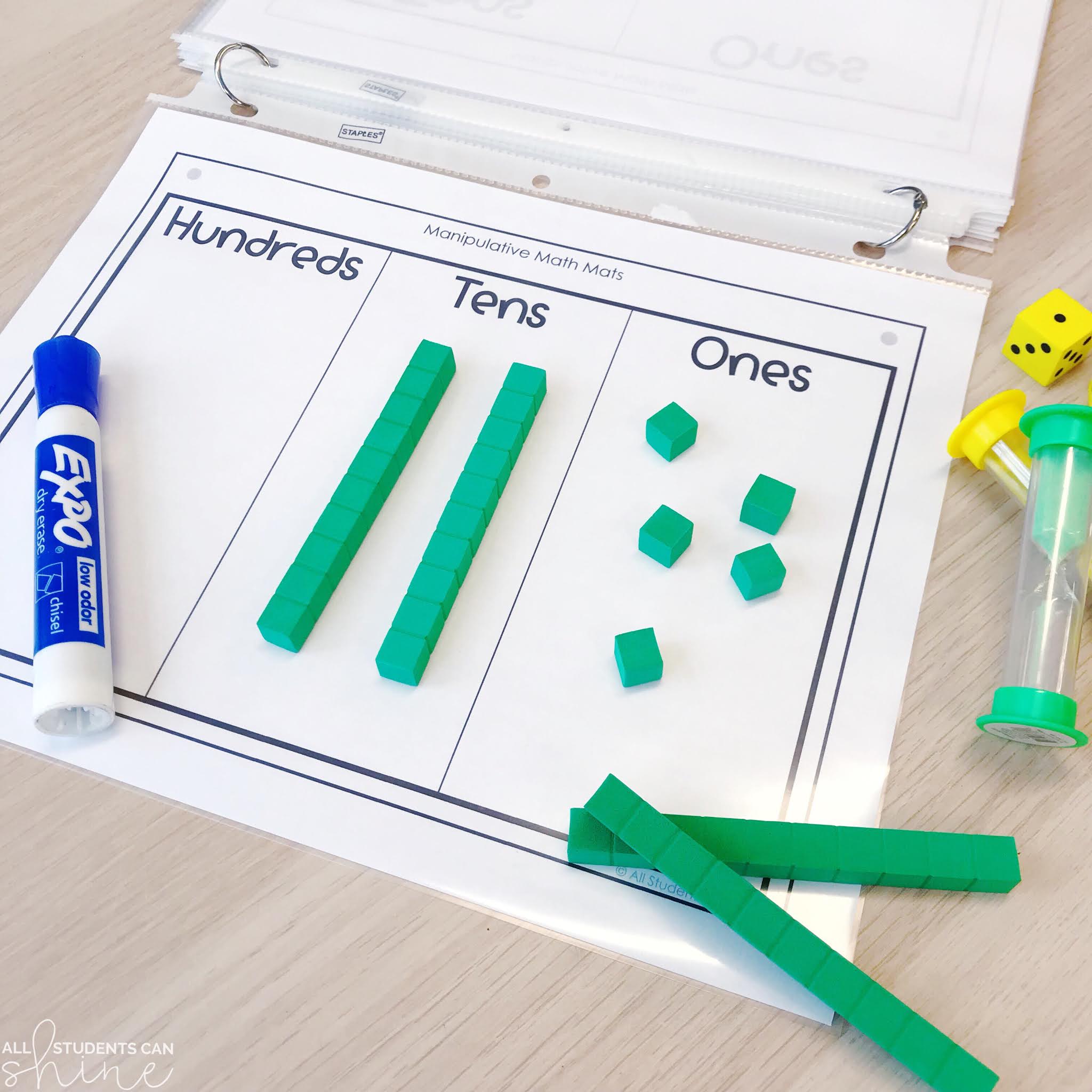 Try giving one type of manipulative to each student for the week. There are a variety of different tasks kids can do with each of them. Manipulative Math flipbooks will give kids the choice between 10-12 tasks that will sustain their learning until you’re ready to switch them out.